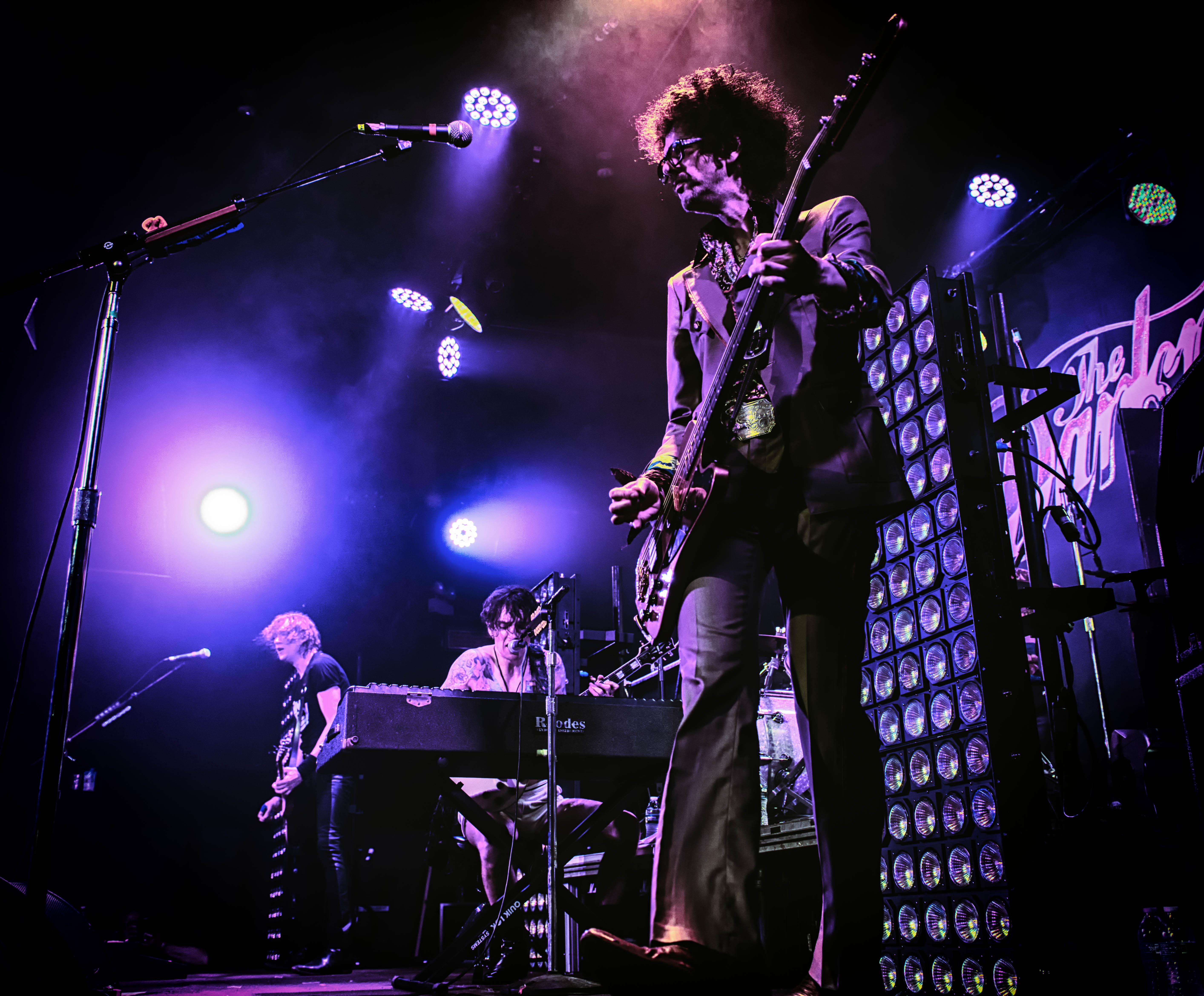 The final song of the night was Love On The Rocks. Justin went out into the crowd on the security guy’s shoulders, like he usually does. He got back onto the stage, and they were going to end the song with Justin telling the crowd how nice they were and how great it was to be back on tour, thank you for being so kind, etc, but the crowd didn’t want them to leave. SO this song went on for what seemed like 20 minutes. The band extended the breakdown which included Frankie scratching his pick on his gold Anniversary Thunderbird bass like it was a turntable. Silly, yes but still a lot of fun.